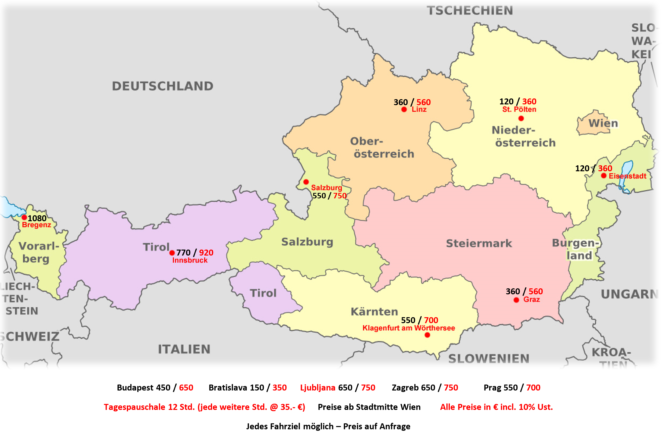 Kein Business-Zuschlag! Zum Fixpreis von € 45,- bringen wir Sie, bis 4 Personen, aus dem Ortsgebiet Wien zum Flughafen Wien-Schwechat. Von 5 - 8 Personen € 10,- pro Person.